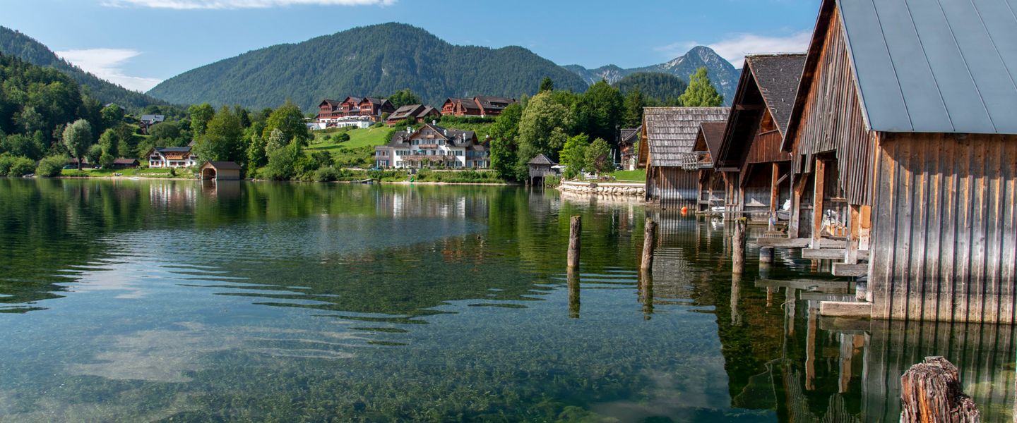 Der Grundlsee liegt im gleichnamigen Ort Grundlsee, eingebettet in das beeindruckende Bergmassiv des Toten Gebirges.